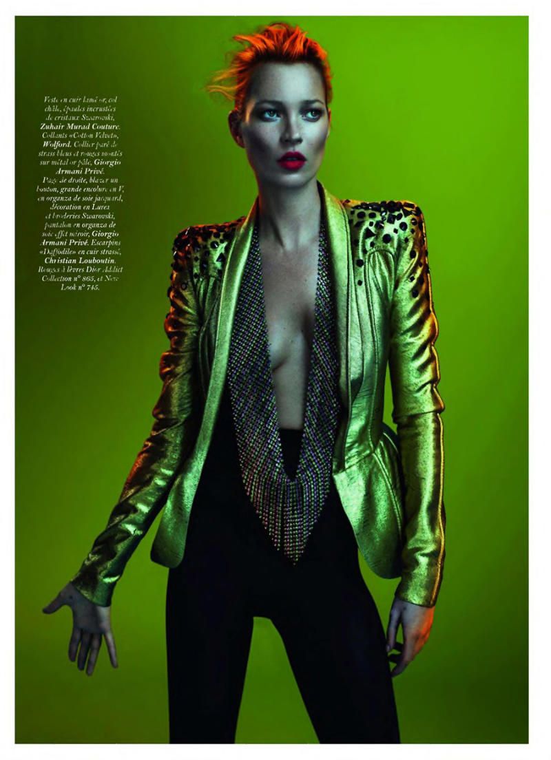 Kate Moss and Mert & Marcus team up once again for a couture eleganza for May’s Vogue Paris. Styled by editor-in-chief Emmanuelle Alt, Kate poses in front of technicolored backdrops while donning the immaculate works of Armani Prive, Atelier Versace and Valentino Haute Couture among others.